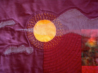 De afgelopen dagen zijn de zon, de wolken en de weg definitief aangebracht. De wolken zijn er met de hand opgenaaid en de zon is omringd door cirkels die er omheen zijn geborduurd.