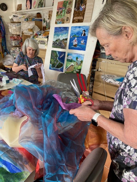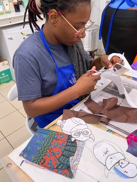.. en iedereen vol overgave begon aan het beplakken van het canvas met vloeipapier en gelmedium